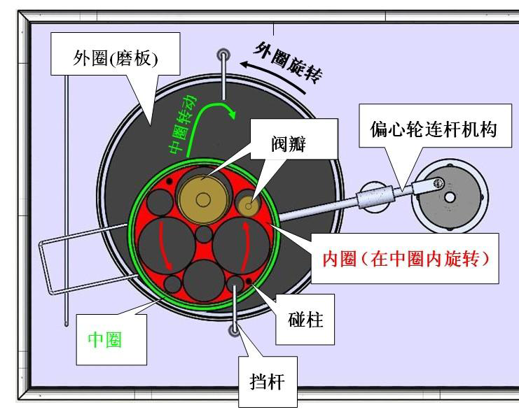 第二轨迹:中圈通过偏心轮连杆机构,作顺时针椭圆轨迹运动。